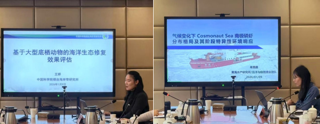 上午的会议由徐宾铎副教授主持。威廉玛丽大学副教授孙铭在线上作了题为《Offshore Wind Development Impacts on Fisheries Stock Assessment》的汇报;美国纽约州立大学博士后尹洁作了题为《Integrating ecological and socio-economic system dimensions to improve fisheries management in the Bohai Sea》的汇报;中科院海岸带所王娇作了题为《基于大型底栖动物的海洋生态修复效果评估》的汇报;水科院黄海所牟秀霞作了题为《气候变化下Cosmonaut Sea南极磷虾分布格局及其阶段特异性环境响应》的汇报。