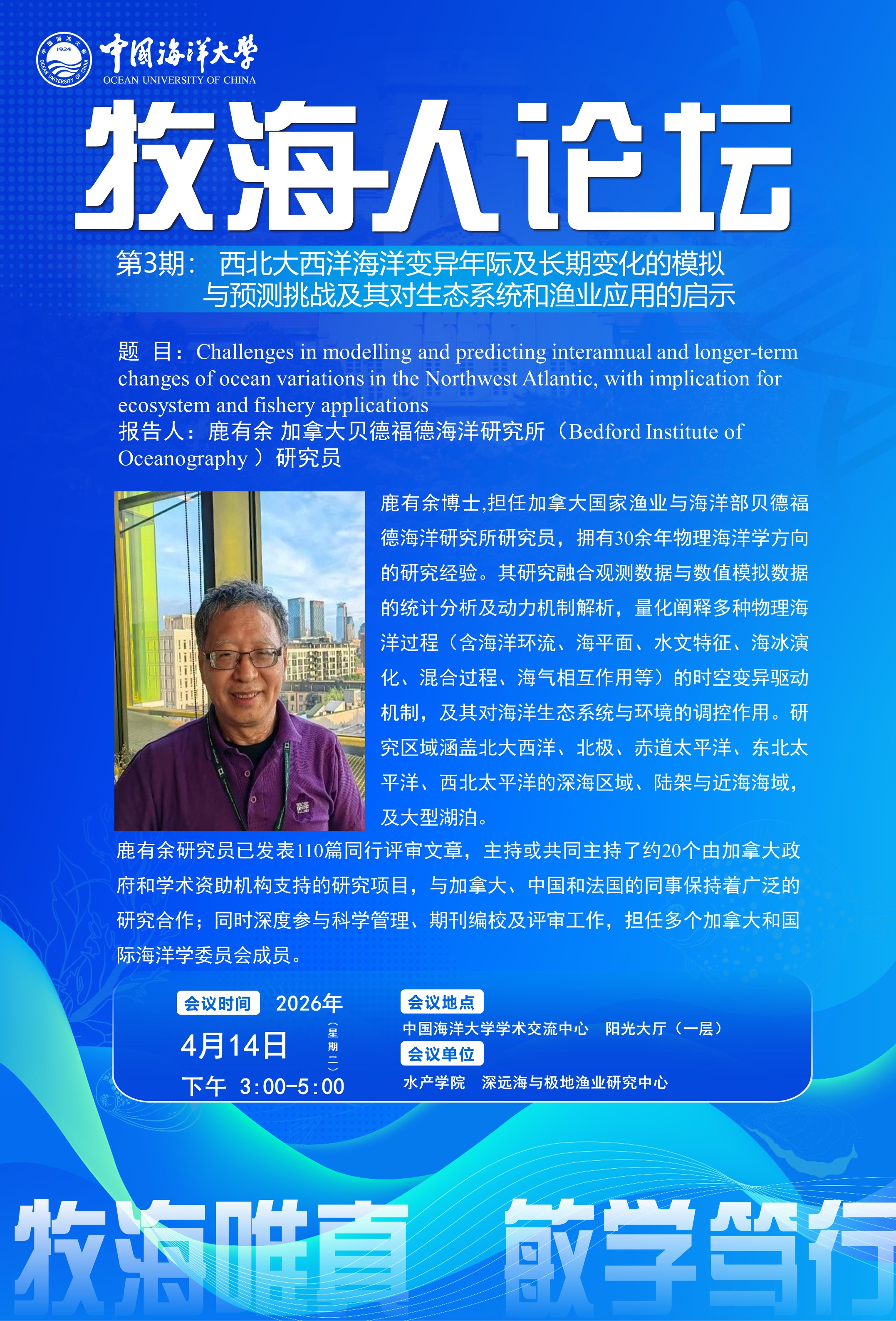 【学术报告】牧海人论坛 第3期 西北大西洋海洋变异年际及长期变化的模拟与预测挑战及其对生态系统和渔业应用的启示